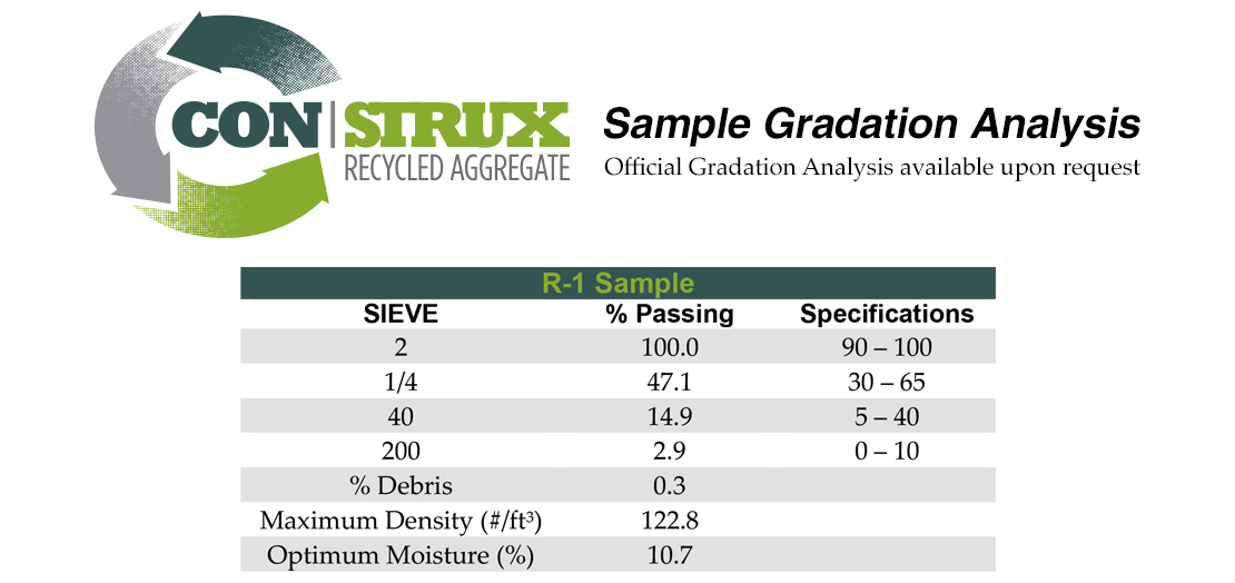 R-52 is a well graded sub-grade material. It has excellent compaction qualities and is screened to less than 3/8". When mixed with water and cement it makes an excellent dry pack. This product can earn you LEED credits and increase your profits by replacing expensive natural stone screenings. Use our fine sub-grade material on your next project.